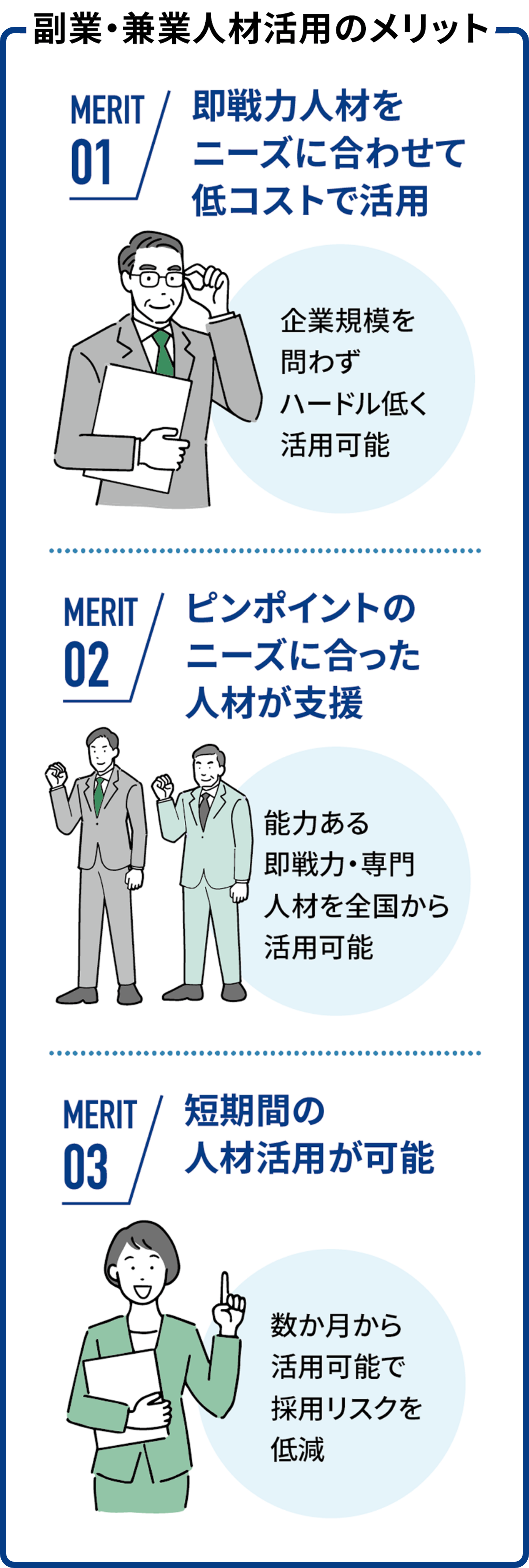 稼動後のサポートまで伴走し不安事や負担を軽減し、安心して副業・兼業人材を採用可能です。